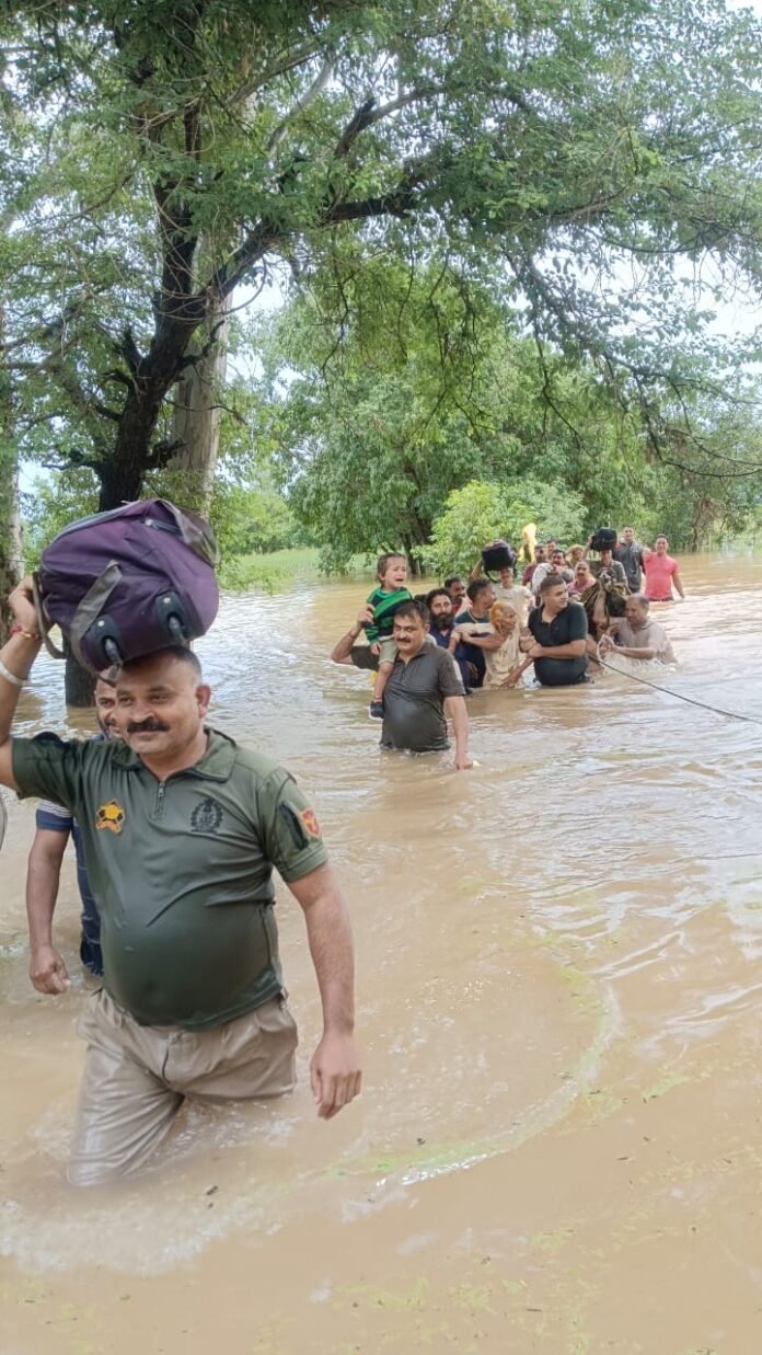 Khour, Jammu:As devastating floods wreak havoc in the region, SHO Neeraj Choudhary, in charge of Khour Police Station, has emerged as a symbol of bravery and dedication. Despite the dangerous conditions, he is leading critical rescue operations to save stranded residents, showing exceptional courage on the ground.